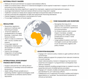 The report, Study on Africa as a Jurisdiction for Domiciliation of Investment Vehicles, identified key actors needed to build a strong domestic investment ecosystem, including national policy makers, regulators, fund managers and investors, international development financial institutions and ecosystem enablers. Recommendations for each one are outlined below.